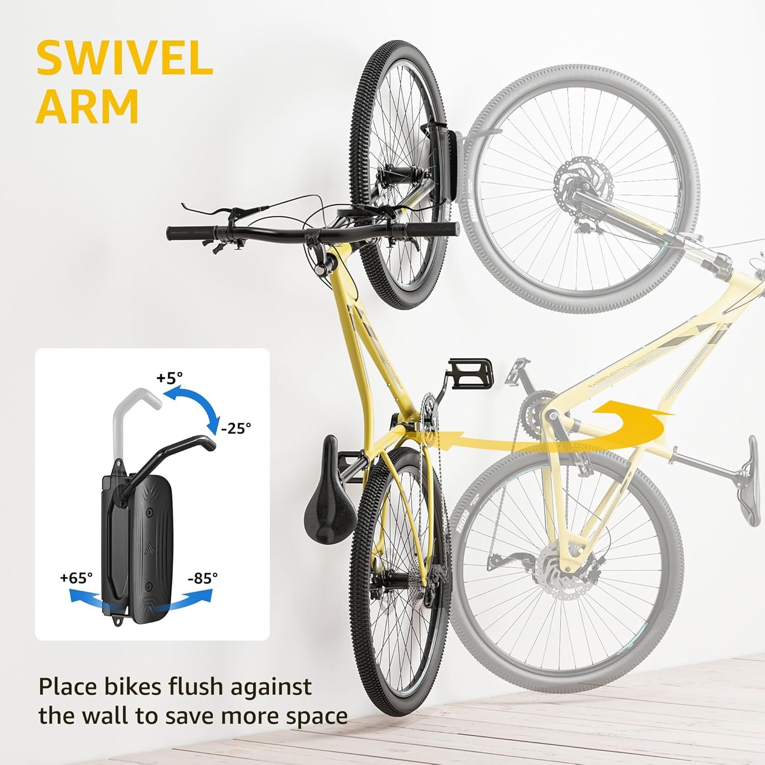 - Swivel Bike Mount for Flexible Positioning: This model uses a ball-bearing swivel system, allowing the bike to pivot up to 150°, perfect for squeezing bikes close to the wall and maximizing available garage space.