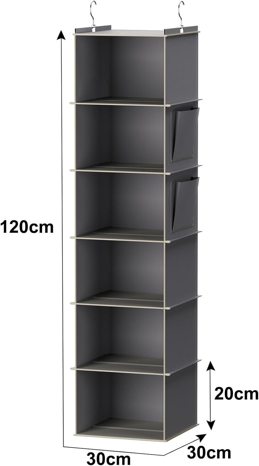 Keep your closet organized and clutter-free with the YOUDENOVA Hanging Closet Organizer and Storage, featuring six sturdy shelves reinforced with bamboo inserts for lasting durability. This space-saving solution includes convenient side pockets for smaller essentials, making it perfect for maximizing closet space and streamlining your morning routine. Designed for easy installation, this organizer is ideal for anyone seeking efficient storage without sacrificing style.