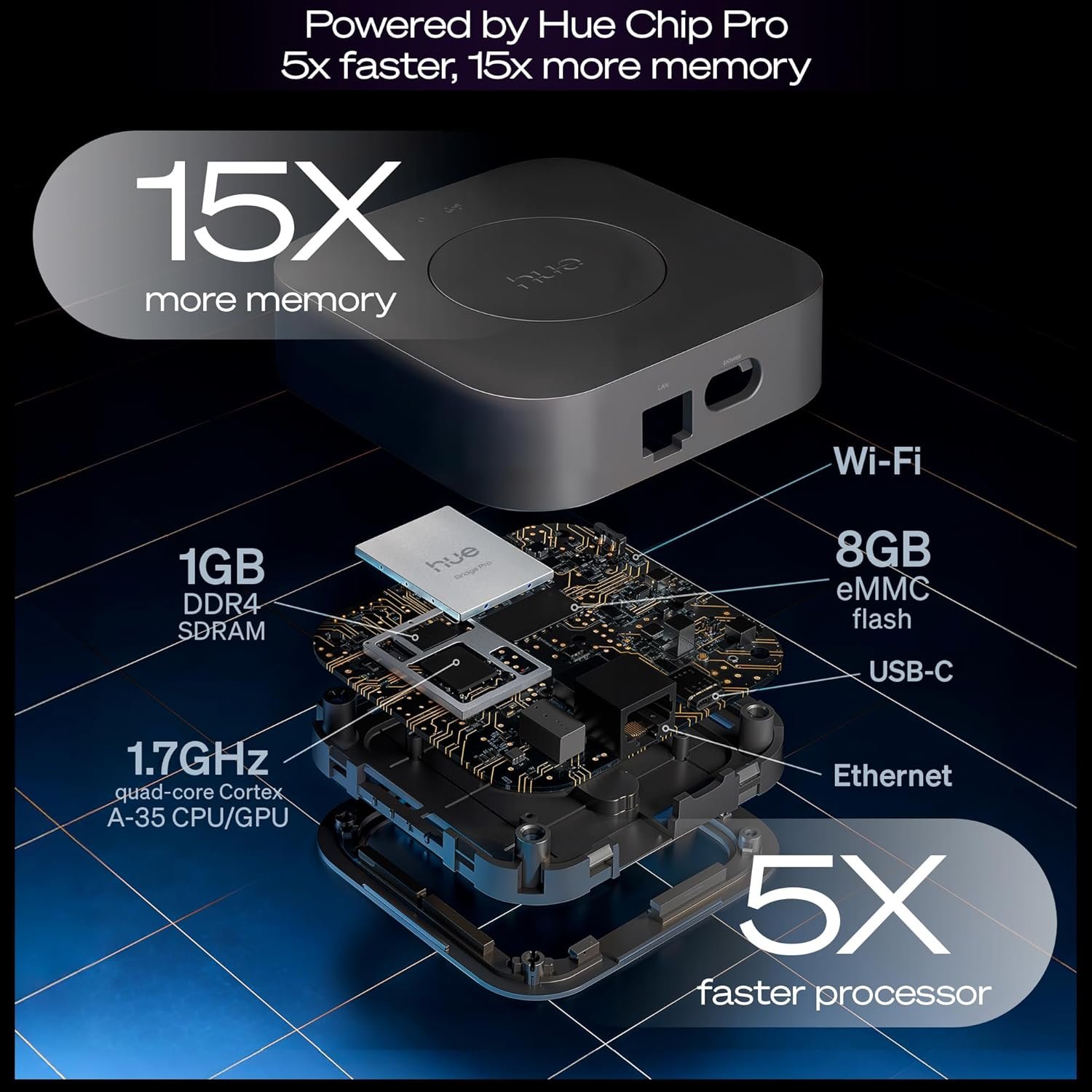 • Ultra-fast processing: 1.7 GHz Hue Chip Pro quad-core CPU enables instant scenes and real-time smart home integration.