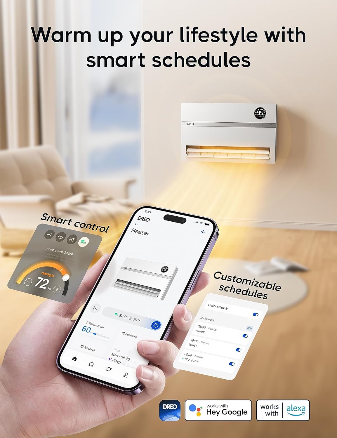 The Dreo Smart Wall Heater combines efficient 120° oscillating warmth with smart features for ultimate convenience, including app and voice control via Alexa or Google Home. Offering precise temperature settings, a 24-hour timer, and ultra-quiet operation, this electric space heater is perfect for bedrooms or indoor spaces up to 200 sq. ft. Enjoy hassle-free installation, easy maintenance, and the reassurance of a leading brand—make comfort smarter with DREO’s WH719S wall-mounted heater.