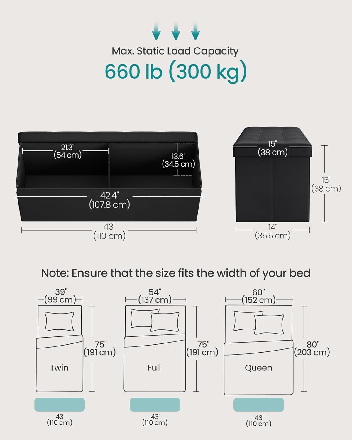 Upgrade your living space with the SONGMICS MAZIE Collection 43-Inch Folding Storage Ottoman Bench—a versatile and stylish solution for extra seating and clutter control. Made from sleek faux leather and crafted for strength, it supports up to 660 lb thanks to durable MDF panels and reinforced corners. With 35 gallons (131 L) of storage, this ottoman easily organizes linens, books, or clothes, while the padded seat delivers lasting comfort. Effortlessly assemble or fold it away, making it perfect for any bedroom, living room, or hallway. Discover the multifunctional convenience and modern design of SONGMICS for your home.